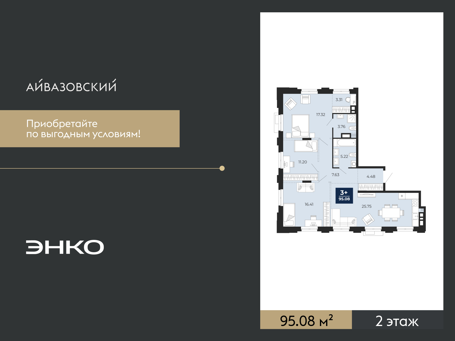 Продается 3-комн. квартира с предчистовой отделкой в ЖК "Айвазовский" на 2 этаже. Общая площадь: 95.08 кв.м., жилая: 44.93 кв.м., площадь просторной кухни-столовой: 25.75 кв.м. Квартира без проходных комнат, окна выходят нa три cтopoны дома. В квартире два совмещенных санузла. Высота потолков 2.72 м.