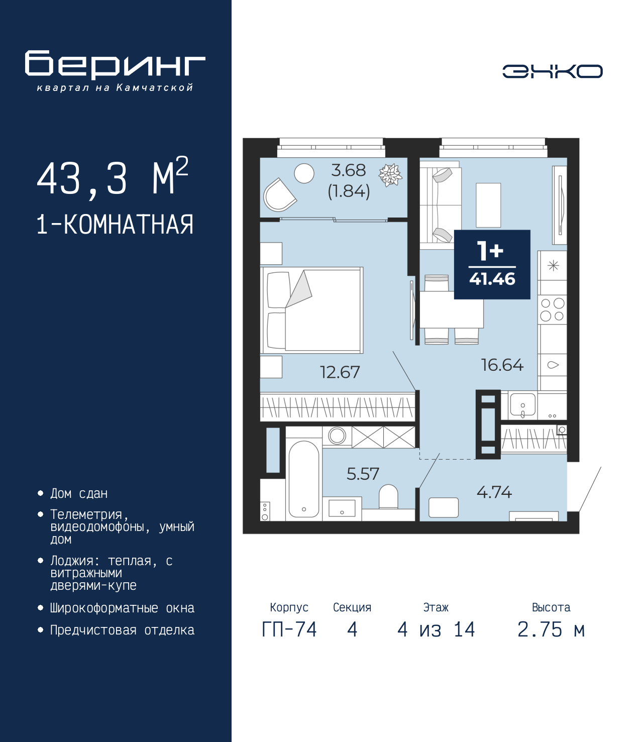 Однокомнатная квартира-студия с предчистовой отделкой в ЖК "Беринг" на 15 этаже. Общая площадь: 38.48 кв.м., площадь гостиной 25.22 кв.м., из которых 10 кв.м. выделено под кухонную зону. Все окна выходят на одну сторону. В квартире один балкон и одна лоджия, один совмещенный санузел. Высота потолков 2.75 м.